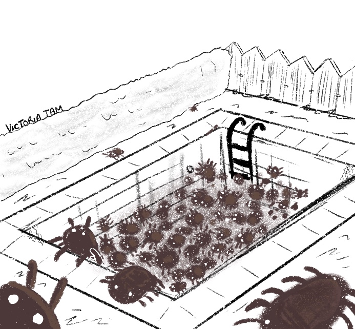 Mr. and Mrs. Davidson’s typically spotless pool, aside from the occasional leaf once Labour Day approached, was completely covered by a massive spiderweb. The silk, thick as rope, ran in layers upon layers over the water, once blue but now a deep green. In the deep end of the pool, a dark mass inched closer to the surface.